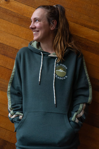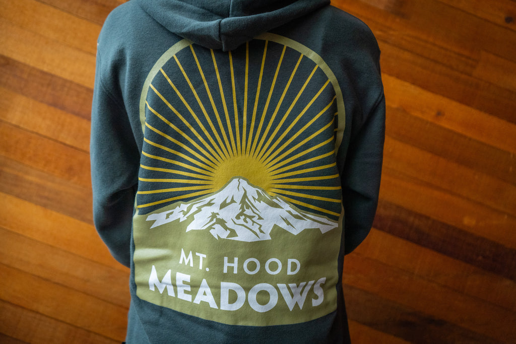 This myrtle green gender-neutral hoodie has a pocket logo of Mt. Hood on the upper left chest and features a full sized Mt. Hood print on the back.